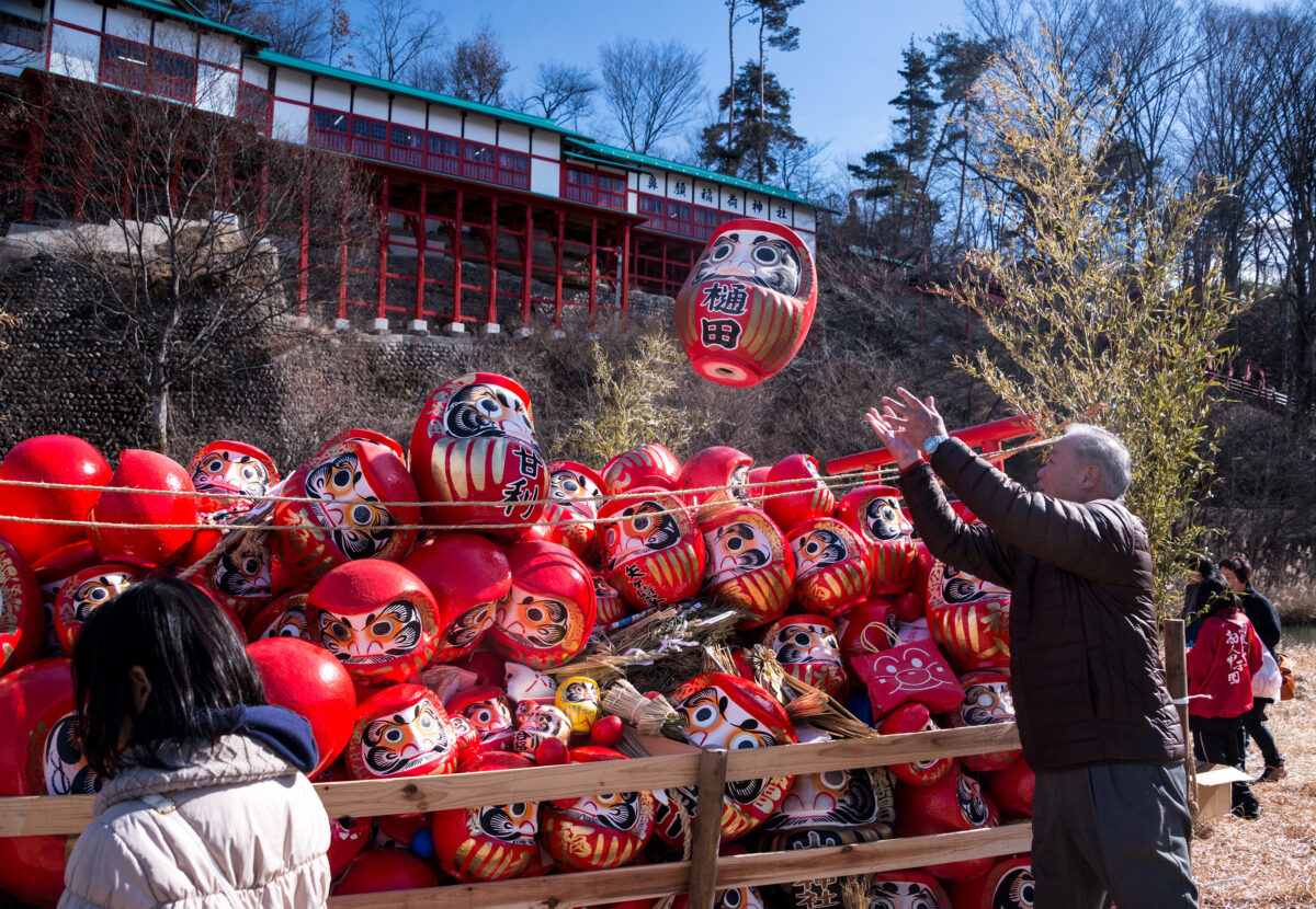 商売繁盛や家内安全祈願の参拝客が訪れ、岩村田商店街から神社への参道には露天が建ち並ぶほか、神社の入口の出店では縁起物のダルマを買い求める多くの人々で賑わいます。
